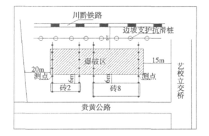 为了研究建筑物在爆破地震作用下的动力响应, 本文对进行大量岩土爆破的众磊家园工程进行了监测。该工程位于贵阳市太慈桥、花溪大道与贵黄公路交叉口的北侧, 因开挖地下室而进行大量的岩土爆破。该工程场地, 南面为贵黄公路, 公路旁有 8层砖混住宅楼及砖混 2层房屋, 北面为川黔铁路。爆区环境示意图如下: