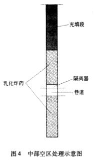 (2)中间位置出现采空区的炮孔,底部正常装药,在巷道顶部使用隔离器进行隔离,使用编织袋进行装药,保证6m的充填高度,以达到破碎上部岩石的作用(如图4所示)。