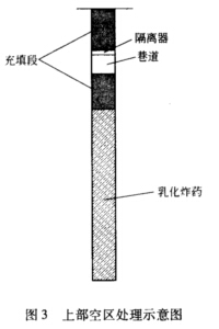 (1)上部位置出现采空区的炮孔,采取底部正常装药,并在采空区的部位使用隔离器和编织袋间隔开空洞再充填,充填高度控制在6m以上(如图3所示)。