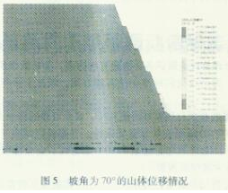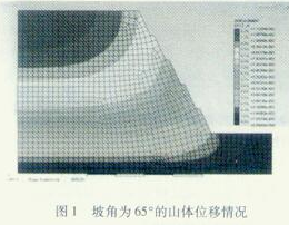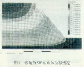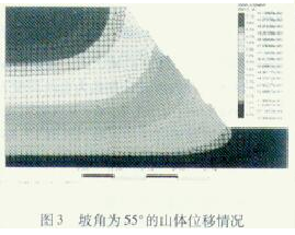 计算分析结果表明,当边坡角为65°、60°、55°和50°时,对于形成的五个台阶永久性边坡来讲,因开挖造成的岩作偏移量分别为0.69mm、0.62mm、0.56mm和0.56mm,即当边坡角小于55°时,偏移量变化很小,可视为处于稳定状态。