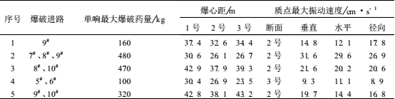 监测结果表明, 单响药量超过 400 kg 时, 质点最大振动速度值超过了安全规定。两次爆破药量超过 400 kg 的爆破, 使测试固结水泥表面出现了部分裂隙。这是因为监测的部位围岩稳定, 无支护, 根据《爆破安全规程》的要求, 其质点振动速度值可以达到30cm/s, 而超过此值的振速将使水泥出现裂隙。测试后对几次爆破进行宏观调查, 围岩体外观未见到明显的破坏迹象。