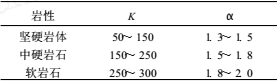 该围岩的 K 、α值符合《爆破安全规程》推荐值( 见表 2) (坚硬到中硬岩体) , 这与实际情况相符合。现取单响最大药量分别为400、200、100kg, 质点安全振速分别为30、20、10cm/s, 计算围岩在该条件下的安全距离如表 3。