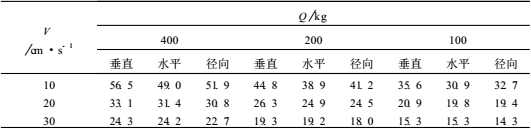 (3) 统计分析表明测试地段围岩为坚硬岩体到中硬岩体, 其K 、α值的范围分别为130~200和1. 30 ~1.60。对于要求不同安全质点振动速度和安全距离的岩体, 进行爆破单响装药量设计时可以参考表 3。本测试结果与爆破安全规程推荐的公式和系数基本相符, 该矿对于其它稳定型类别岩体的爆破参数设计, 可按该规程进行。