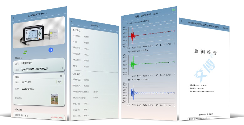 用户可通过手机客户端独立完成爆破振动监测工作,该客户端功能齐全,能帮助客户完成设备管理、参数设置、报警设置、数据查看、监测报告制作与下载等工作。